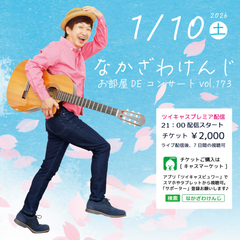 生放送ですので、予定の時間になると視聴できます。「なかざわけんじプレミア配信ライブ」の告知は、なかざわけんじFB、当HP上や、ツイキャスアプリで告知致します。また、チケット購入者は生放送から7日間は公開中の録画を視聴することができます
