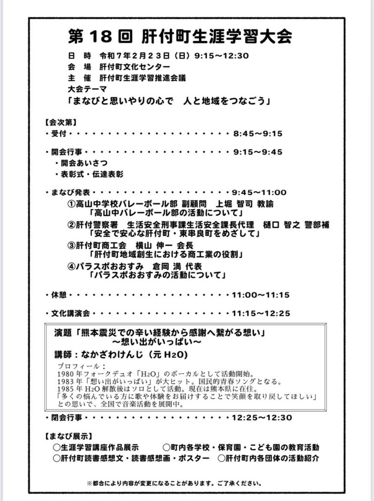 2月23日(日)鹿児島県肝属郡肝付町「肝付町文化センター 大ホール」で歌とおしゃべり講演会があります。